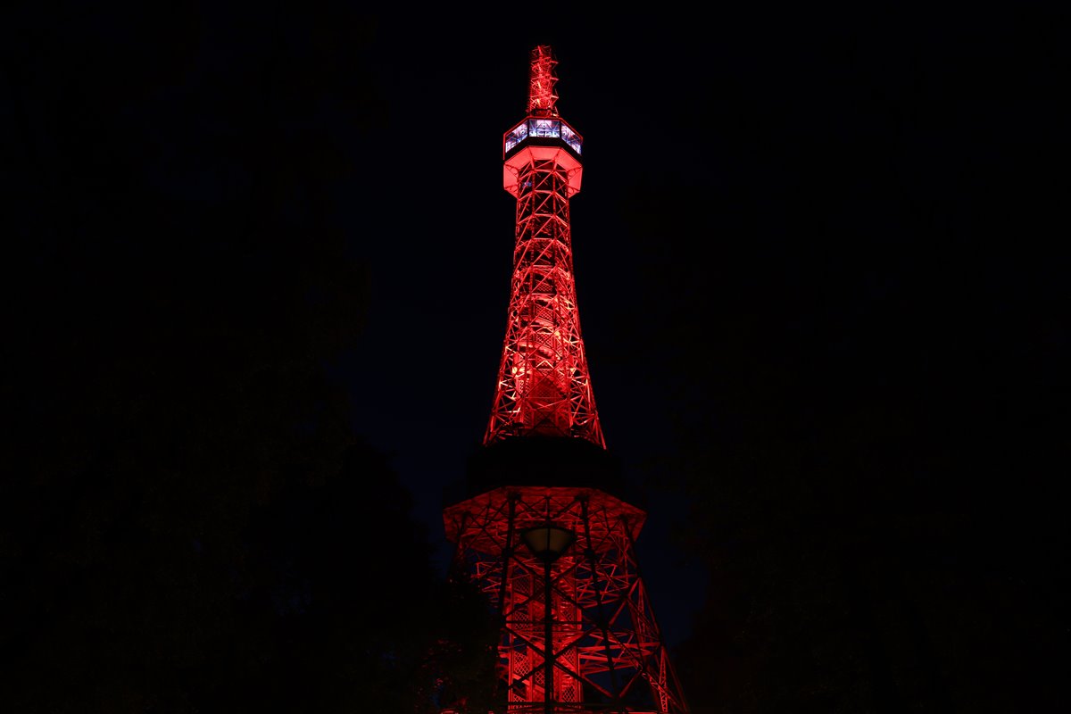 Petřínská rozhledna svítila například ve francouzských barvách při útoku na redakci Charlie Hebdo a po požáru Notre-Dame, pravidelně září zeleně na irský svátek sv. Patrika, modře zářila letos jako připomínka dne autistů.
