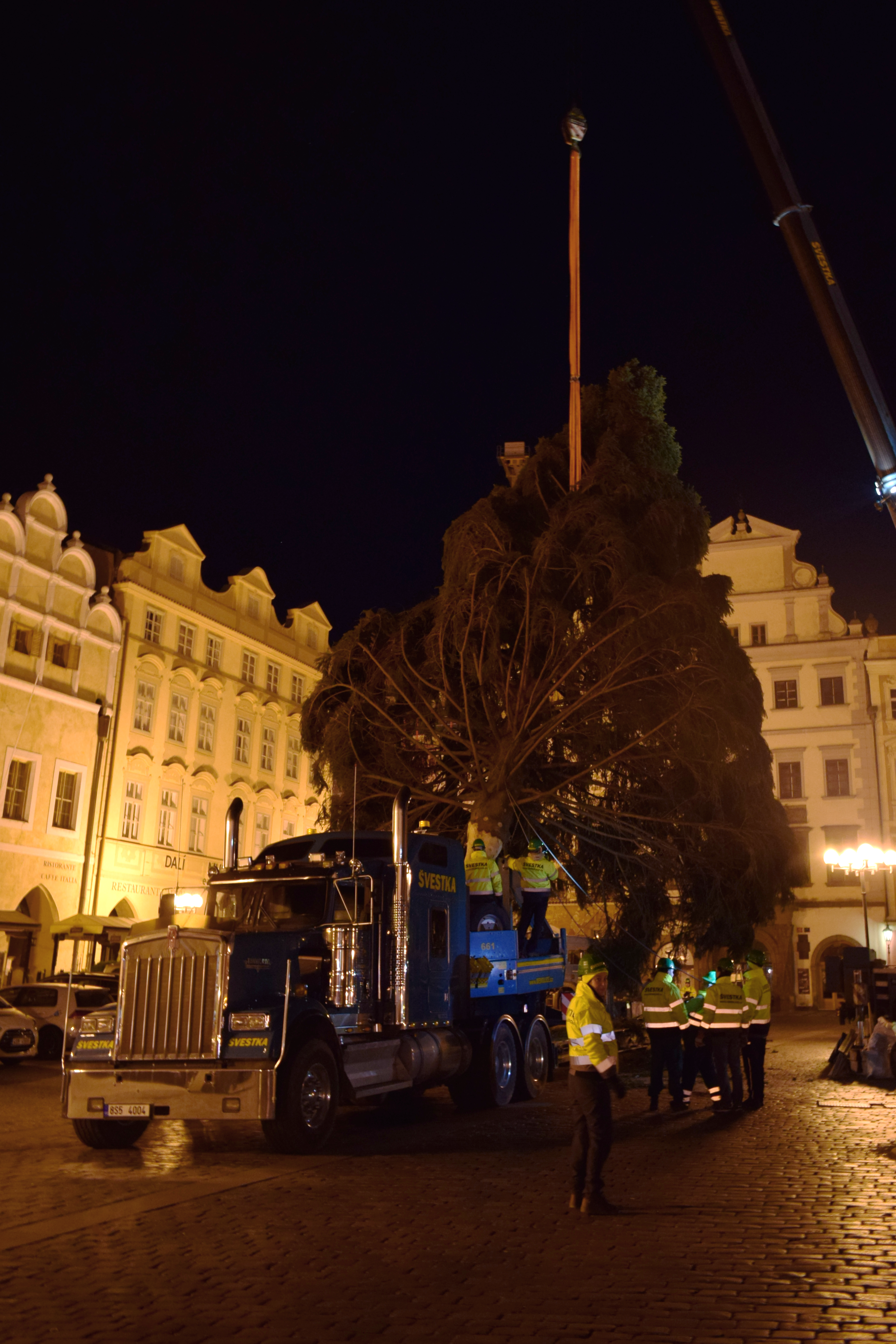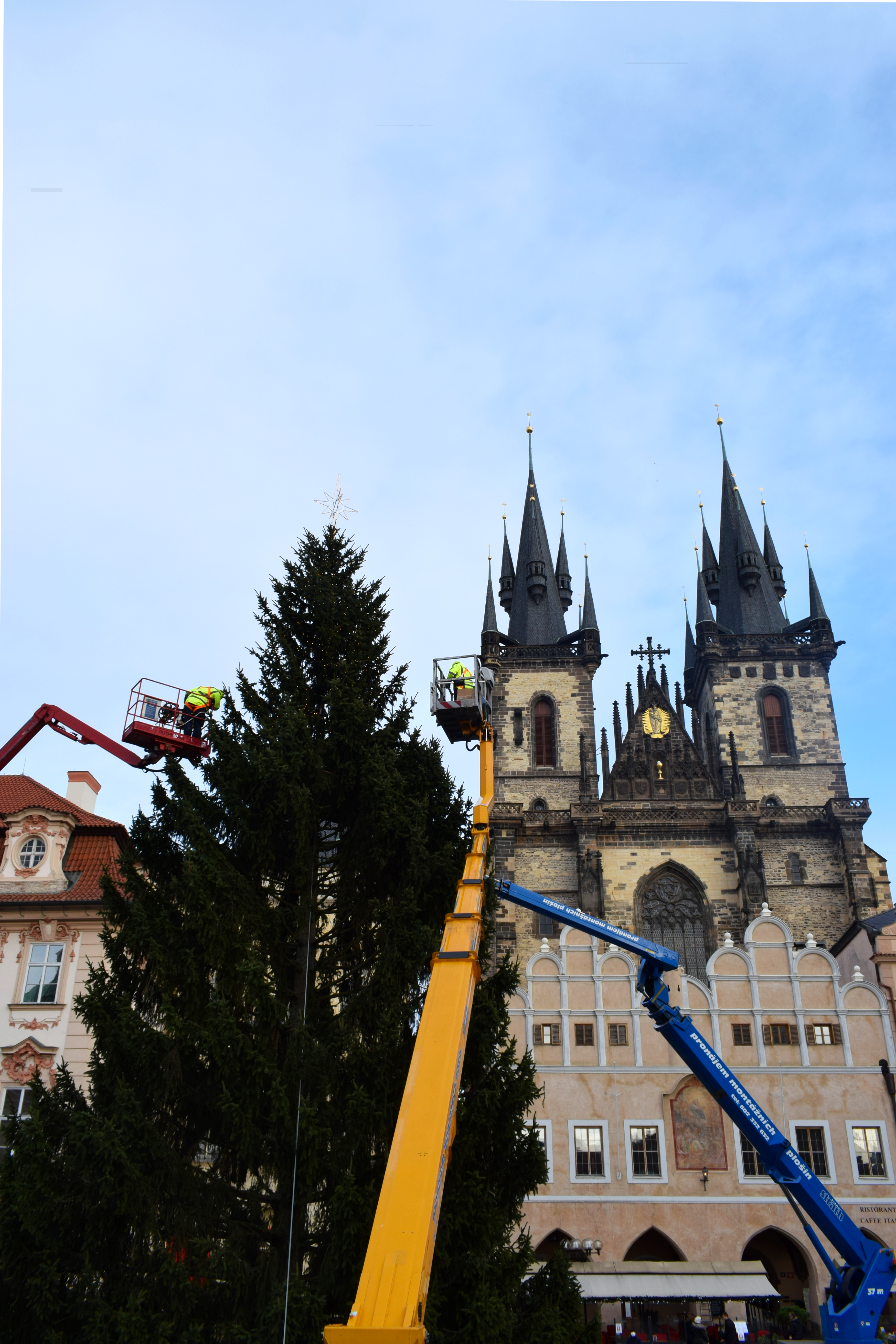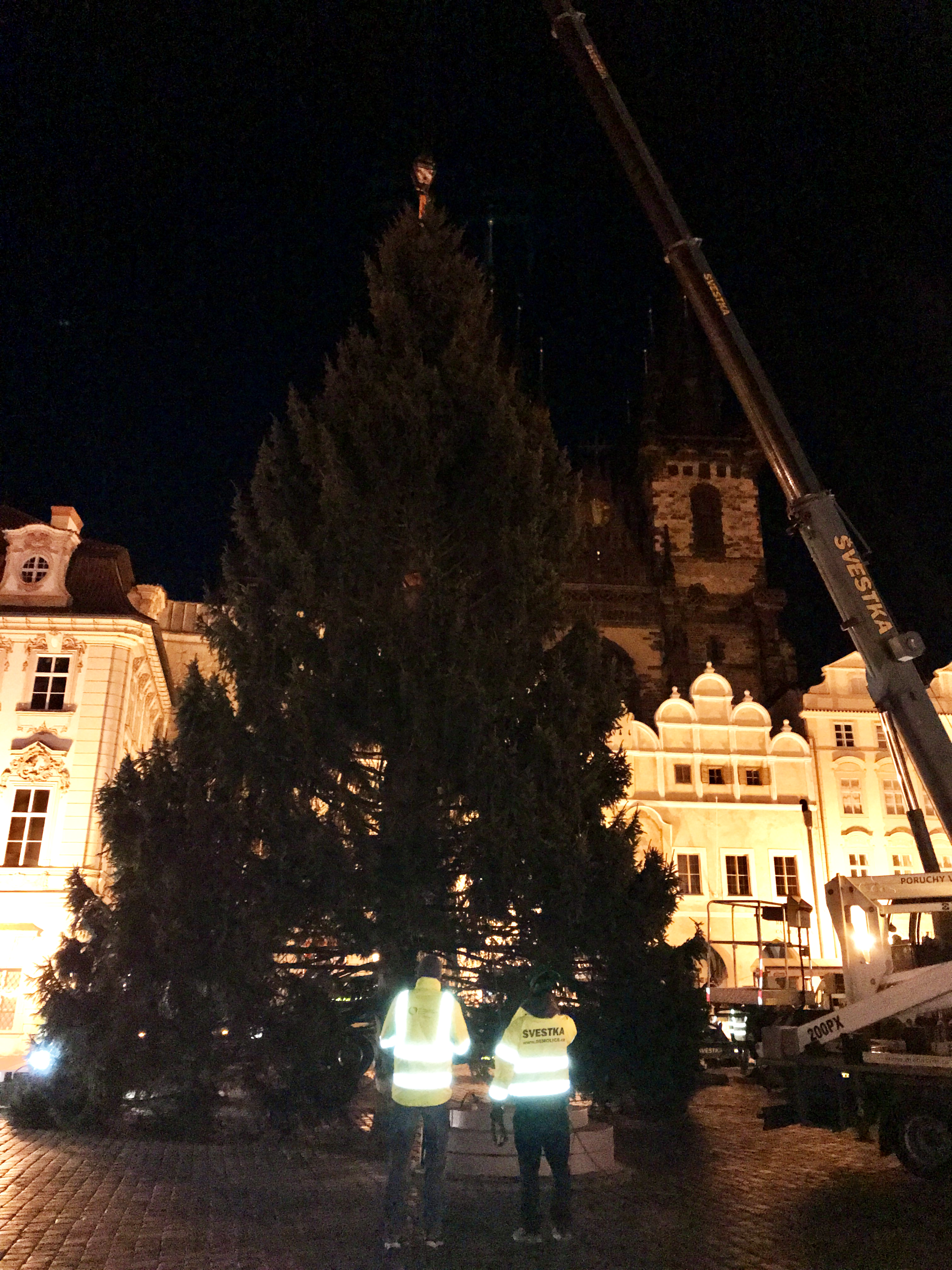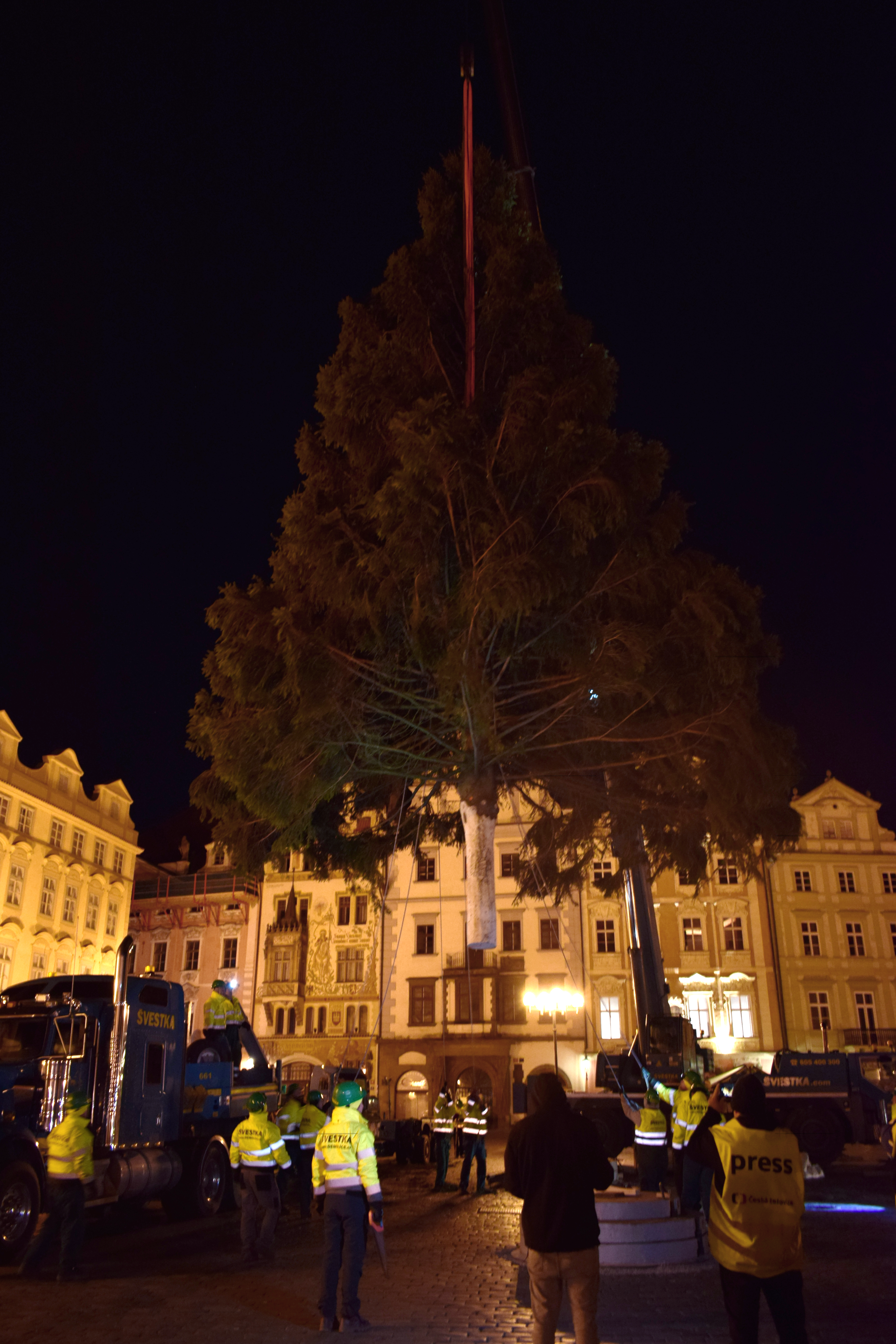 Ještě v neděli čekala strom zhruba stokilometrová cesta do deponie v pražské Hostivaři, kde přenocoval a vyčkal do pondělního večera na přesun do centra metropole. „Aby došlo k co nejmenšímu narušení dopravy v Praze, převáželi jsme strom za doprovodu policie v pozdních nočních hodinách. Následně jsme ho na Staroměstském náměstí postavili a zajistili lany kotvenými k jeřábovým závažím, celá akce trvala zhruba do třetí hodiny ranní,“ uvedl místopředseda představenstva THMP Tomáš Novotný.