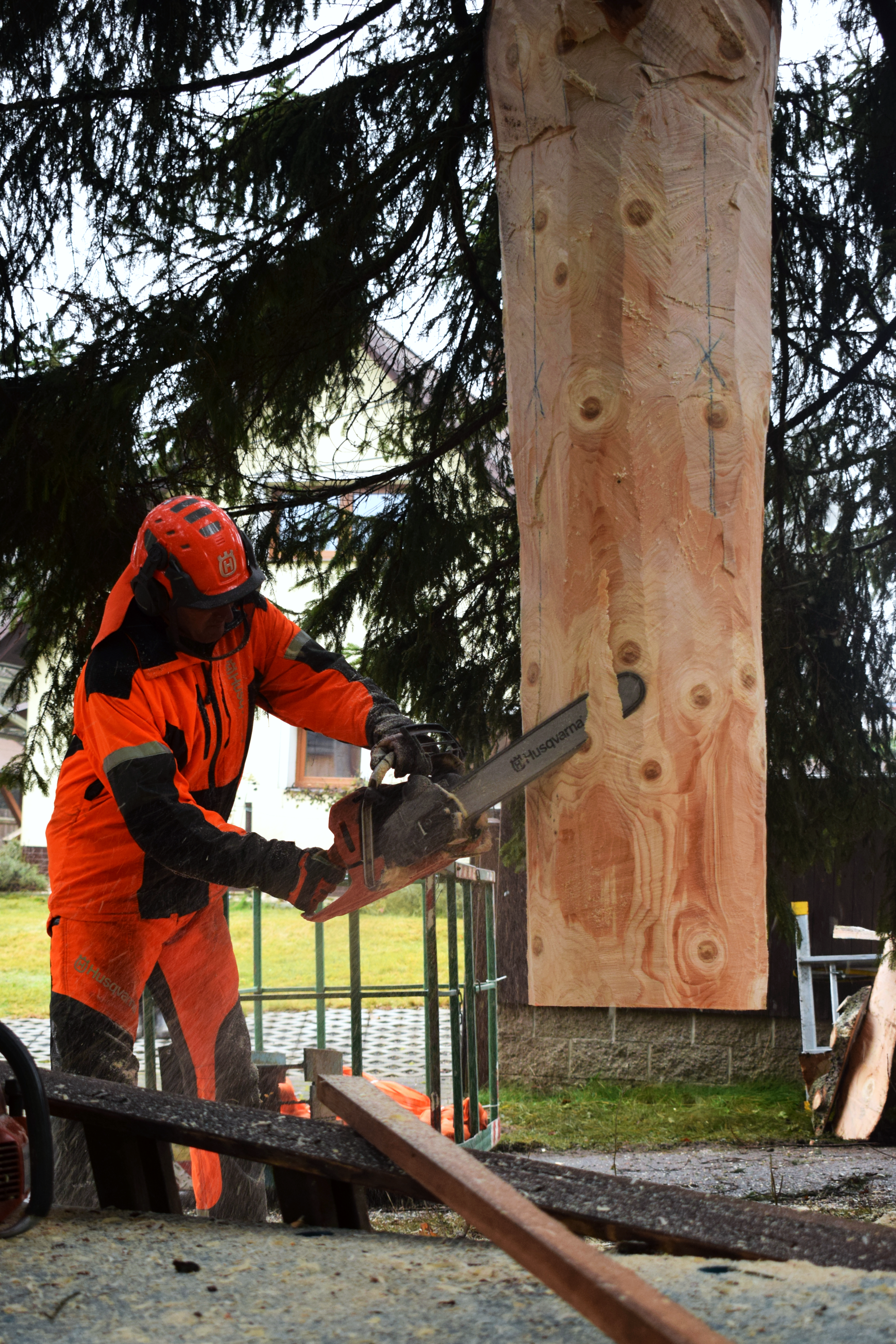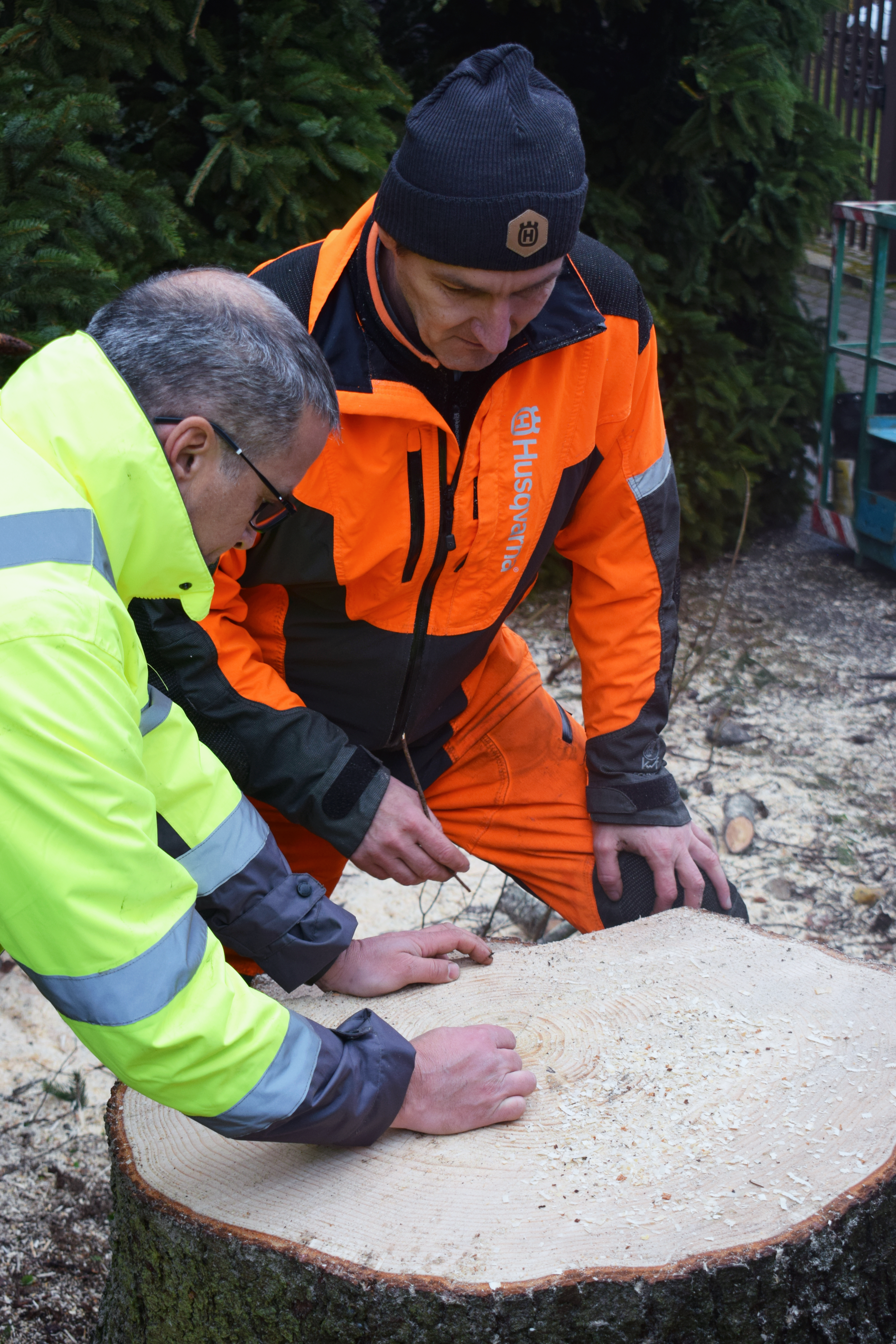Mohutný, dvaadvacet a půl metru vysoký smrk, který bude letošní ozdobou Staroměstského náměstí, pokácel dřevorubecký mistr republiky v neděli 21. listopadu. „Celý proces trval asi čtyři hodiny. Strom se musel nejdřív zavěsit na lano jeřábu, aby bylo jeho kácení bezpečné a nepolámaly se větve. Samotné řezání trvalo chvíli, nějaký čas už ale zabralo opracování spodní části kmene, aby měl požadovaný průměr a vešel se do kotvící šachty na Staroměstském náměstí. Strom pak bylo nutné ještě opatrně položit na návěs speciálního tahače a svázat všechny větve, tedy celkově ho připravit na převoz do Prahy,“ prozradil předseda představenstva THMP Tomáš Jílek, který v závěru akce spolu s dřevorubcem spočítal letokruhy letošního vánočního stromu. „Došli jsme k 56 letům. Bylo to trochu jako ve škole, měl jsem trému, že stromu uberu nebo přidám,“ dodal s úsměvem.