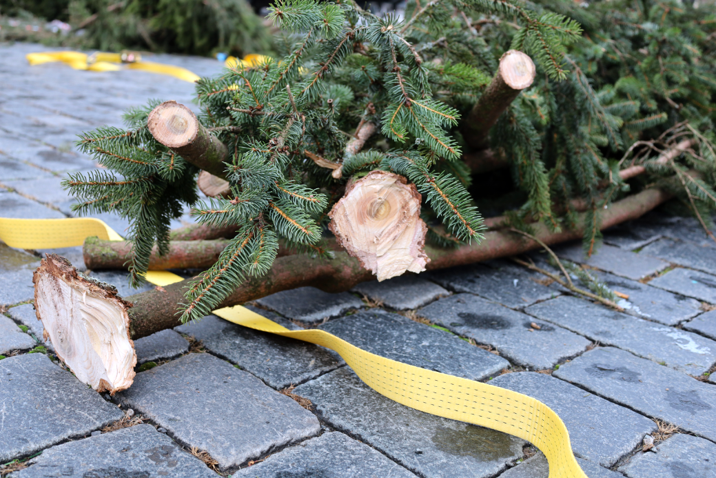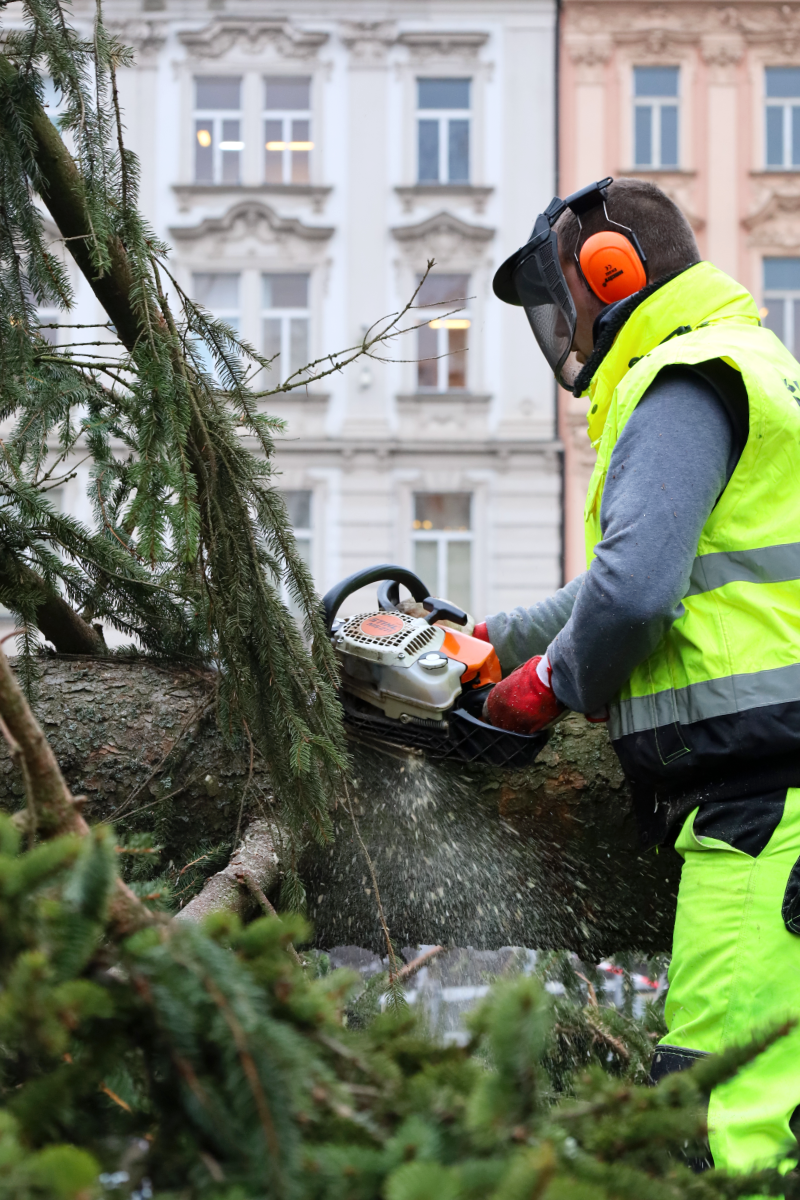 V pondělí přišlo na řadu sejmutí stromu. Přes dvaadvacet metrů vysoký smrk se zavěsil na lano jeřábu a položil na zem. Ještě na Staroměstském náměstí se ořezaly větve a kmen se rozdělil na několik čtyřmetrových kusů. „Větve odvezeme tradičně do pražské zoologické zahrady. Kmen pak po rozřezání na prkna a hranoly poputuje do střední odborné školy v pražském Jarově, kde jej studenti zpracují k prospěšným účelům,“ vysvětlil radní hlavního města Prahy Jan Chabr.
