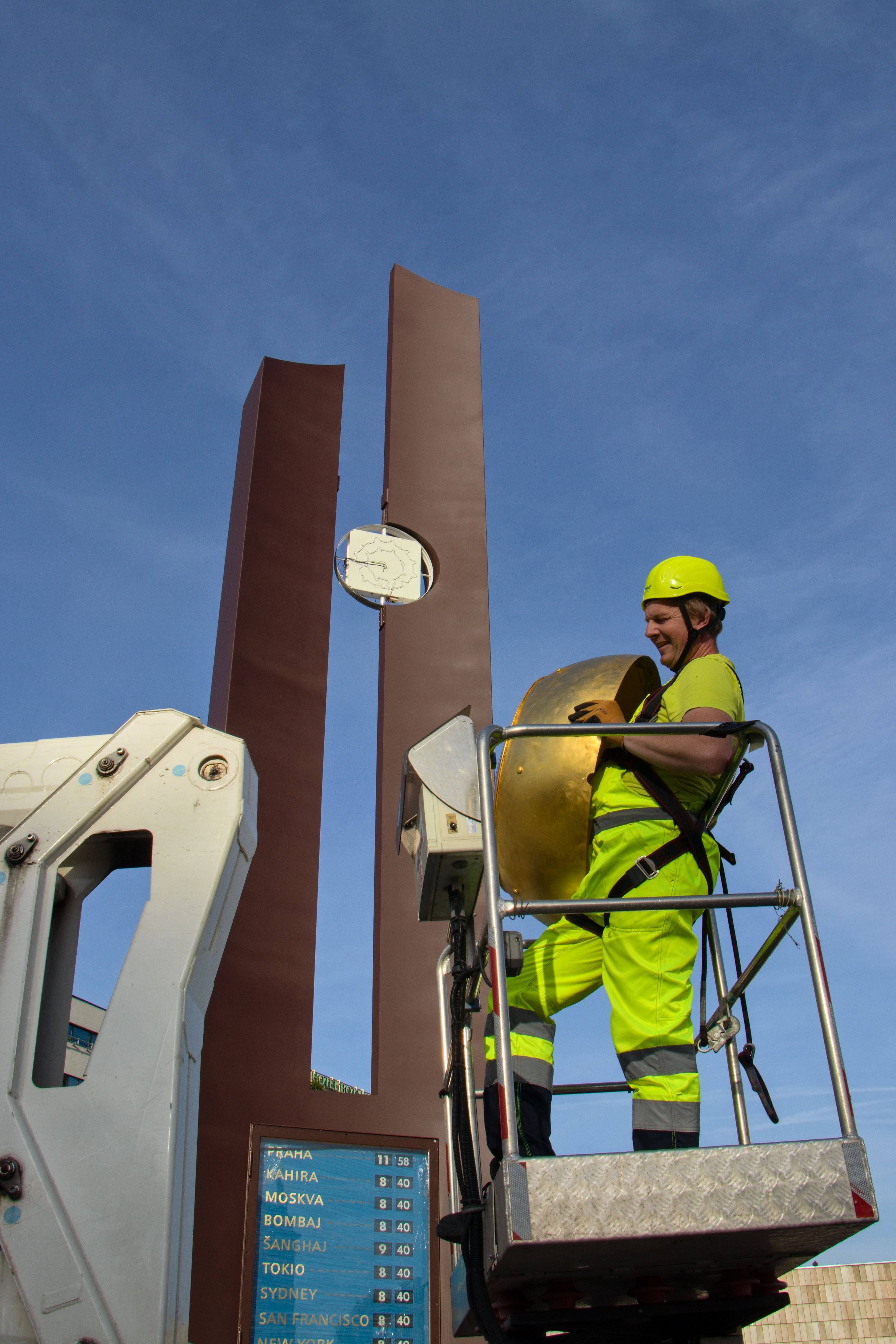 Praha, 23. října 2023 – Unikátní plastika výtvarníka Rudolfa Svobody s kulovými hodinami a tabulí světového času dominovala prostranství u stanice metra Florenc od roku 1985. V roce 2020 musela být z bezpečnostních důvodů demontována poté, co servisní technici Technologií hlavního města Prahy při plánované obnově hodinového stroje zjistili rozsáhlou korozi hlavní konstrukce. Jako řešení opravy bylo zvoleno zhotovení její repliky s repasí obou unikátních ukazatelů času. Kompletní renovace celého díla v těchto týdnech spěje do finiše. Nová konstrukce je již usazena na svém místě, následně na ni byly instalovány hodiny. Podle plánu by měla plastika času v novém kabátě znovu sloužit Pražanům od poloviny listopadu.
