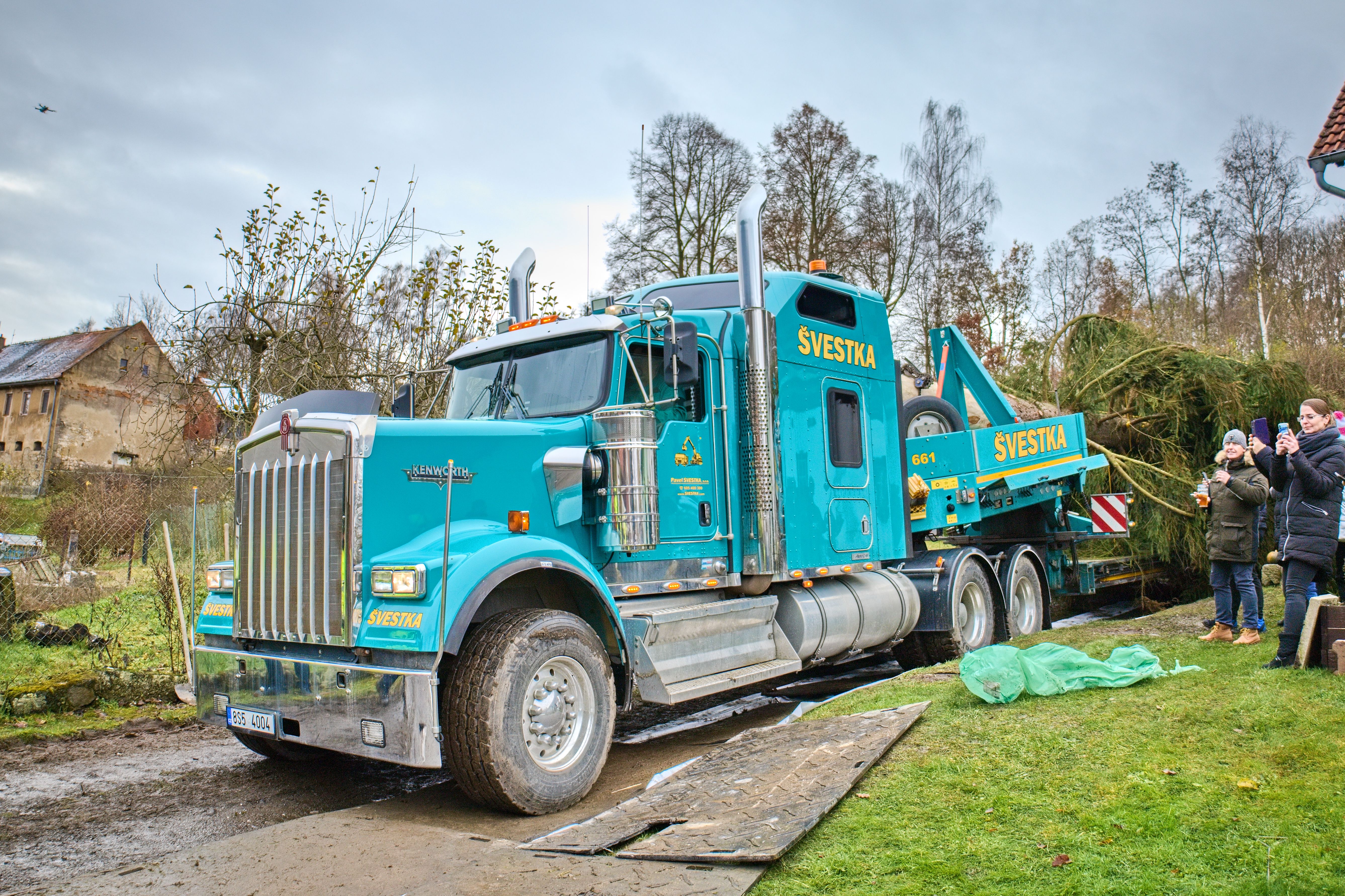 Strom pojede z místa kácení do logistického areálu v obci Praha – Kbely. Poveze jej tradičně americký truck Kenworth s podvalníkem upraveným pro převoz stromu jako nadměrný náklad.